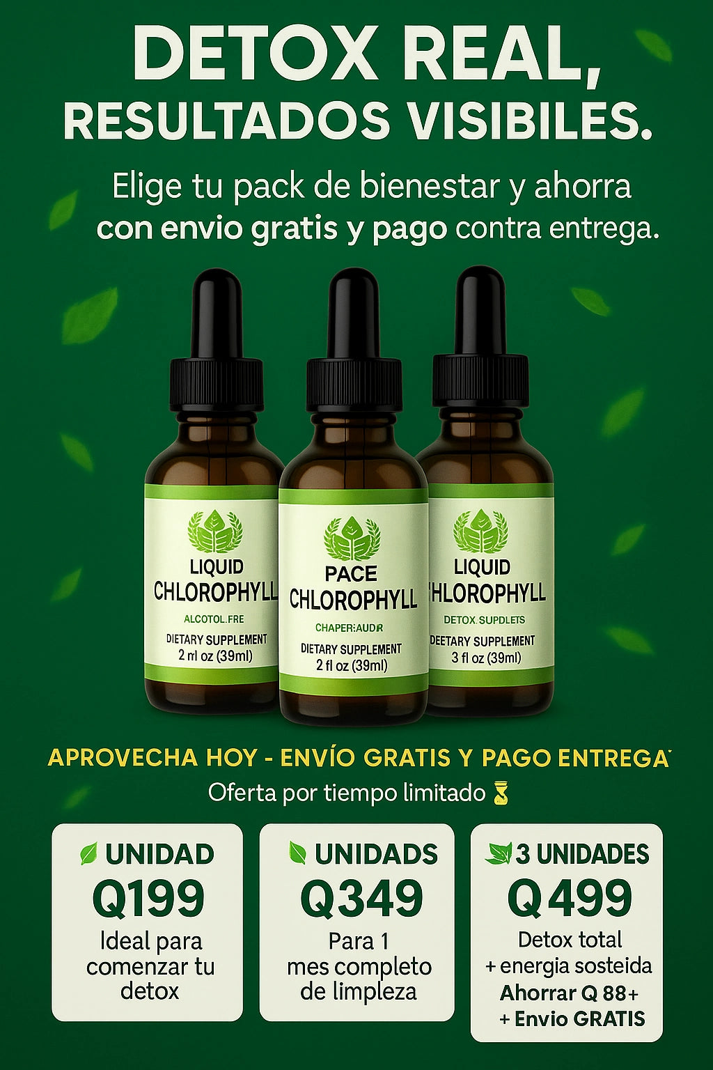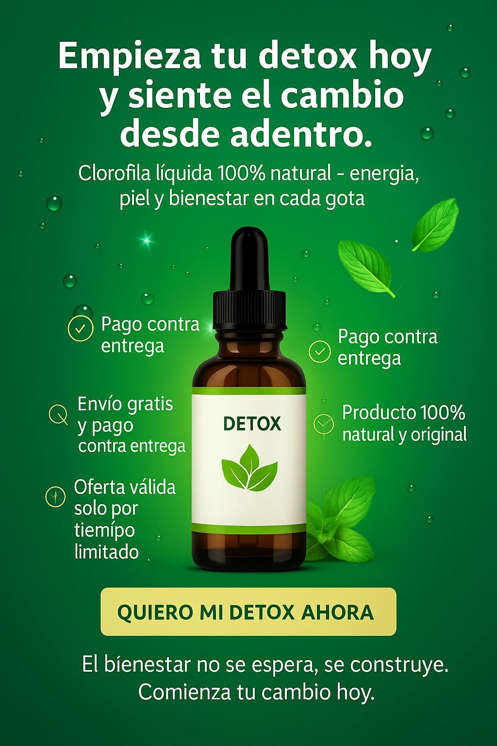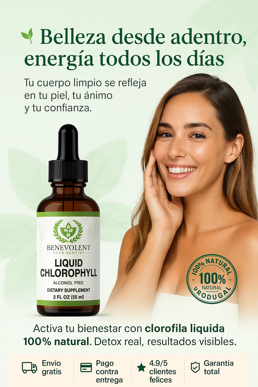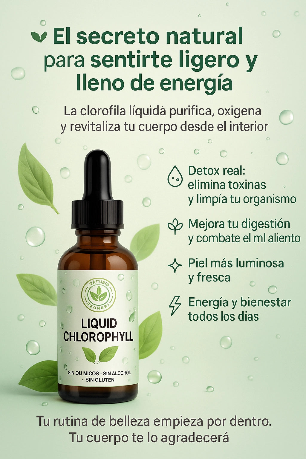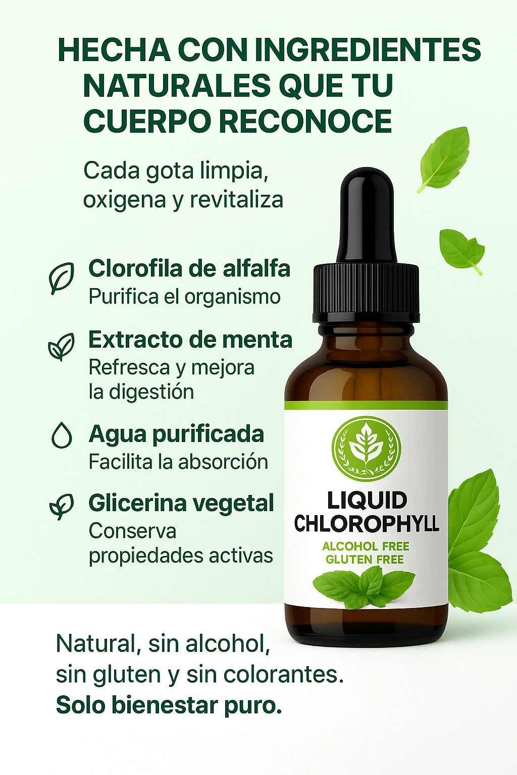 La clorofila líquida ayuda a depurar el organismo, eliminar toxinas, mejorar la digestión y oxigenar la sangre, lo que se traduce en más energía, piel más limpia y una sensación general de bienestar. Además, refresca el aliento y apoya la salud intestinal de forma natural.